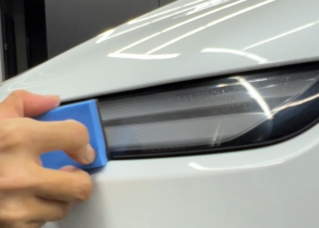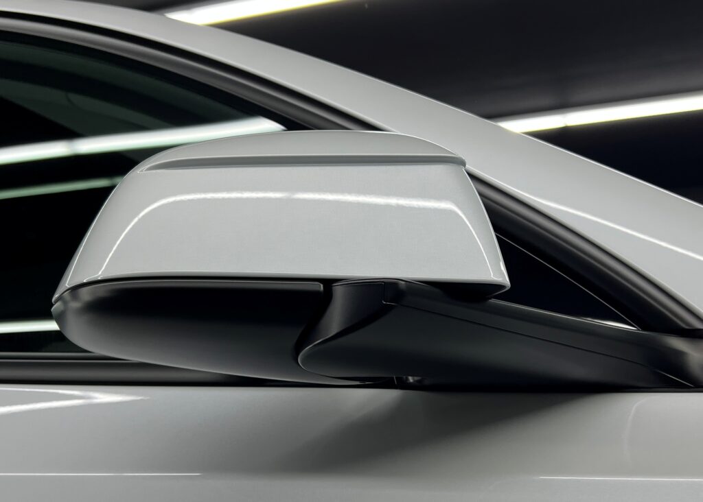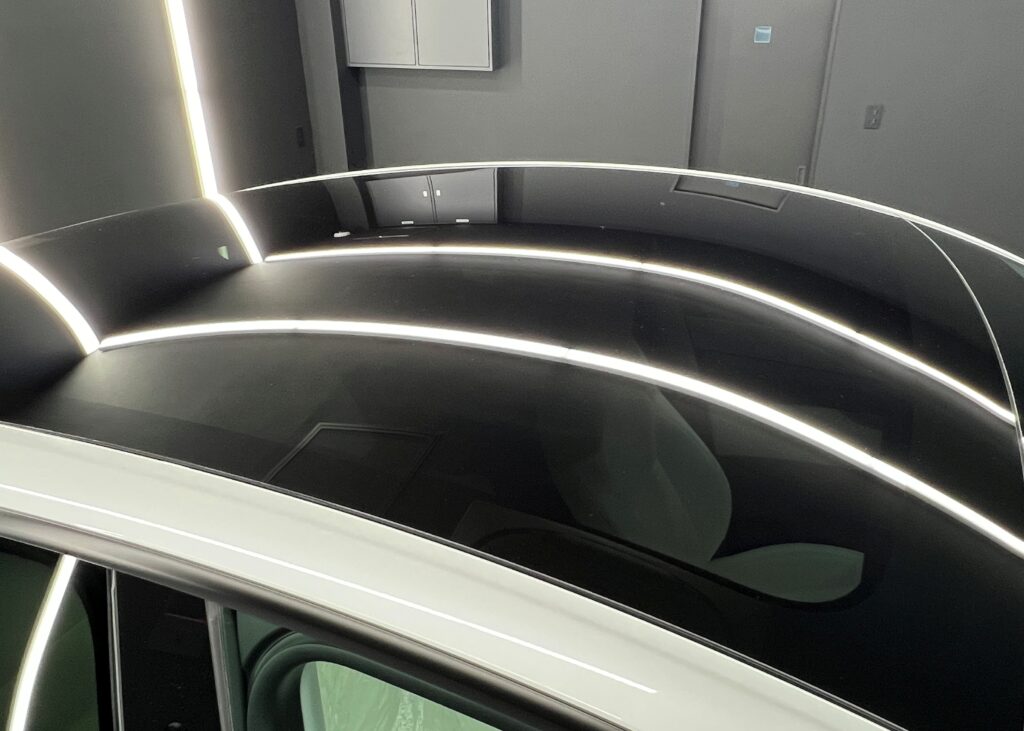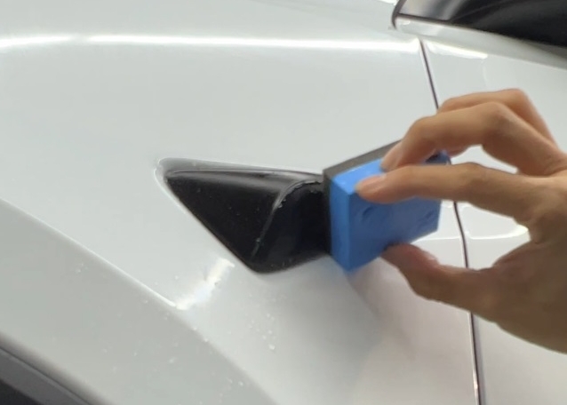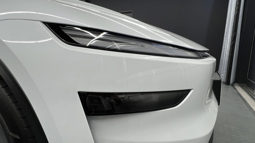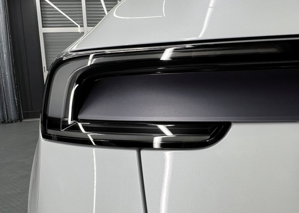 洗車を終え、コーティング作業に入ります。コーティングと言えば、ボディだけのイメージを持たれるかもしれませんが、マジベルセラミックRGCコートでは、ボディ・ホイールや、特に気になる未塗装樹脂パーツにも施工をいたします。テスラモデルYは未塗装樹脂のパーツも多い為、長期にわたる使用で白化を抑制していく効果ももたらします。ヘッドライトやテールランプ、メッキパーツやナンバープレートにもコーティングを施します。ルーフのカラスや窓ガラスにもコーティングをおこないますので、ほぼ車体全てにコーティング施工を致します。※ゴム類は、施工をいたしません。