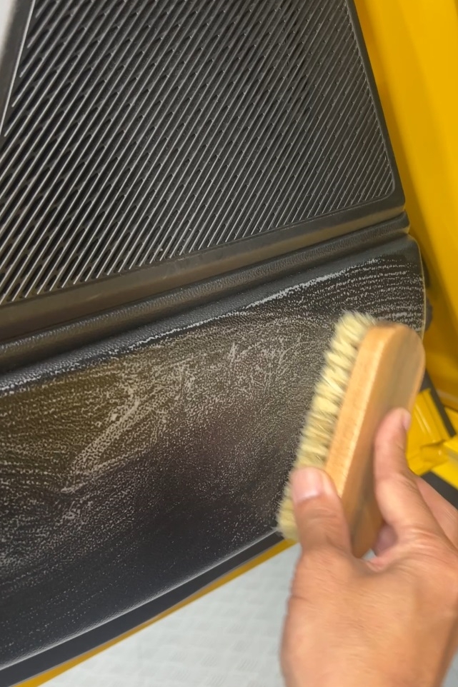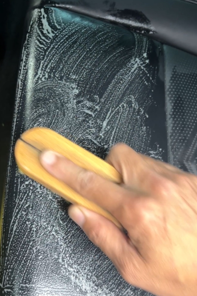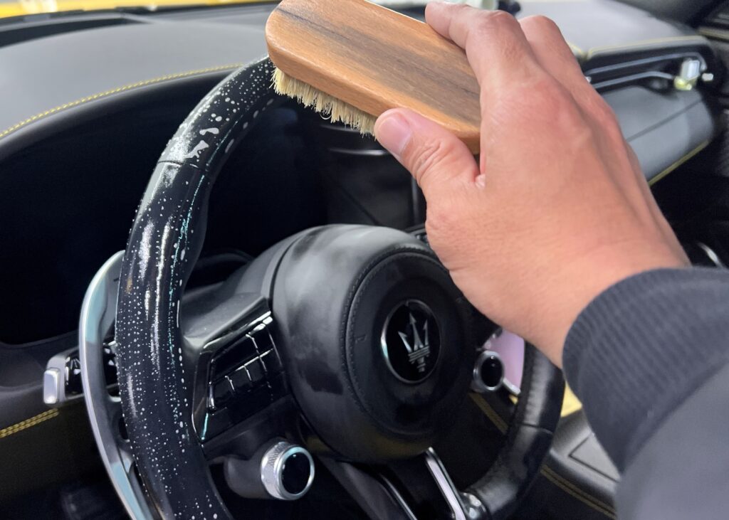 購入から少し時間が経過している場合でも、まずは徹底したクリーニングから行います。一見綺麗に見えるシートやドアの内張りも、皮脂や微細な汚れが付着しているものです。これらが残ったままではコーティング剤が素材にしっかりと浸透しないため、専用クリーナーで丁寧に洗浄。特に手に触れる機会が多いステアリングやドアノブ、シートは、特に入念に汚れを落とし、素材を「素」の状態に戻していきます。