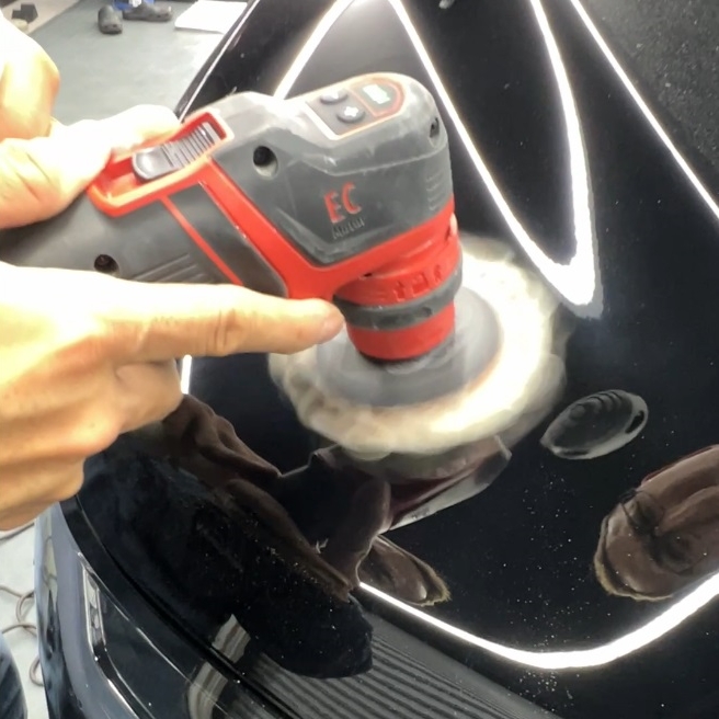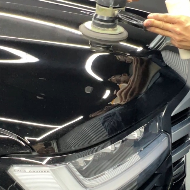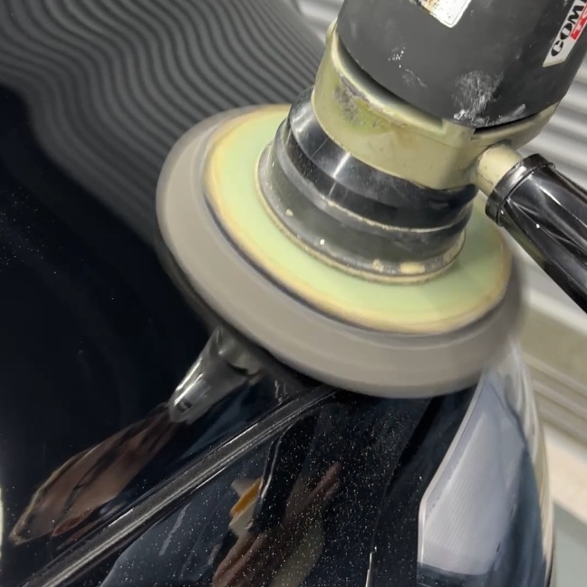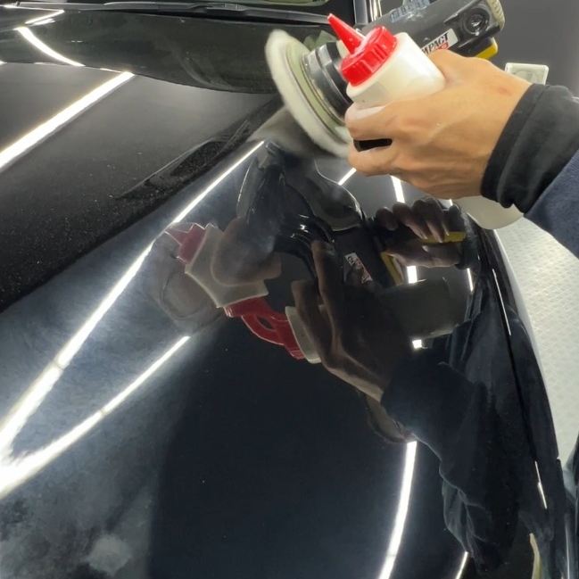 熟練の技術者がポリッシャーを使用し、新車特有の曇りや小傷を丁寧に整える「鏡面研磨」を実施します。