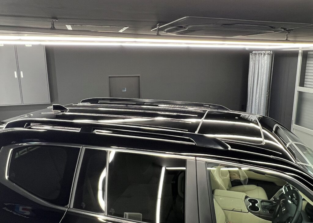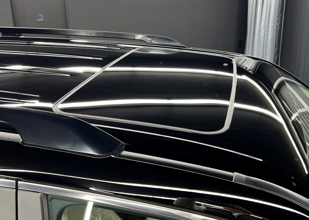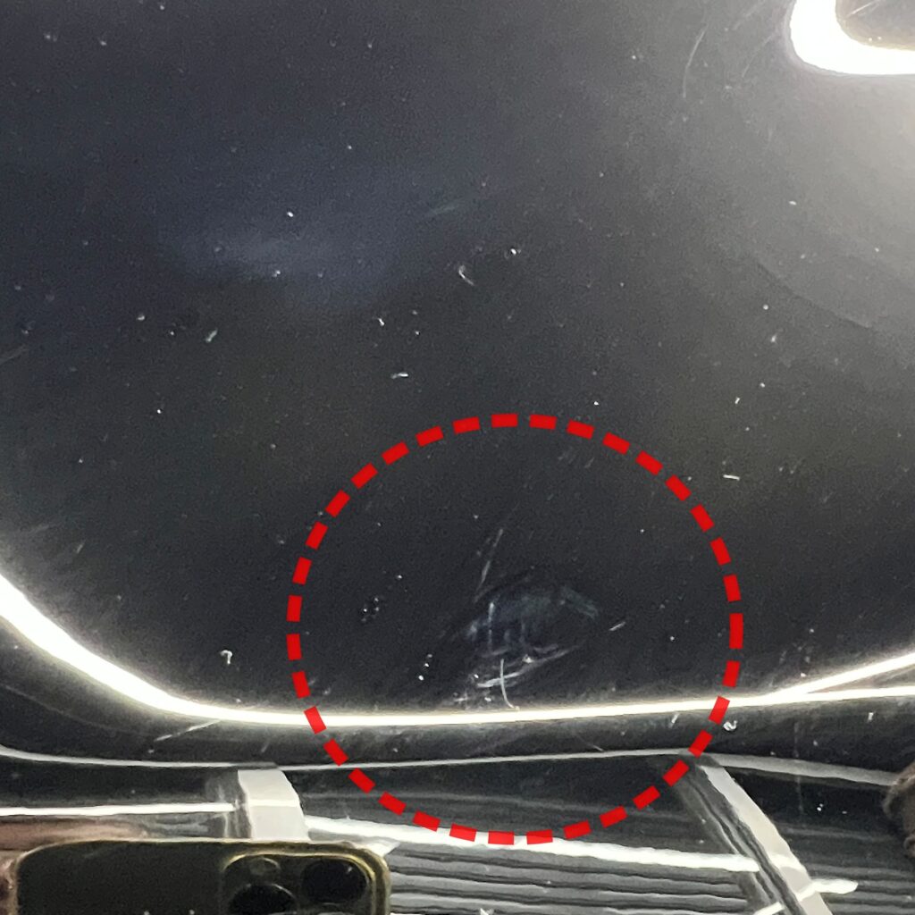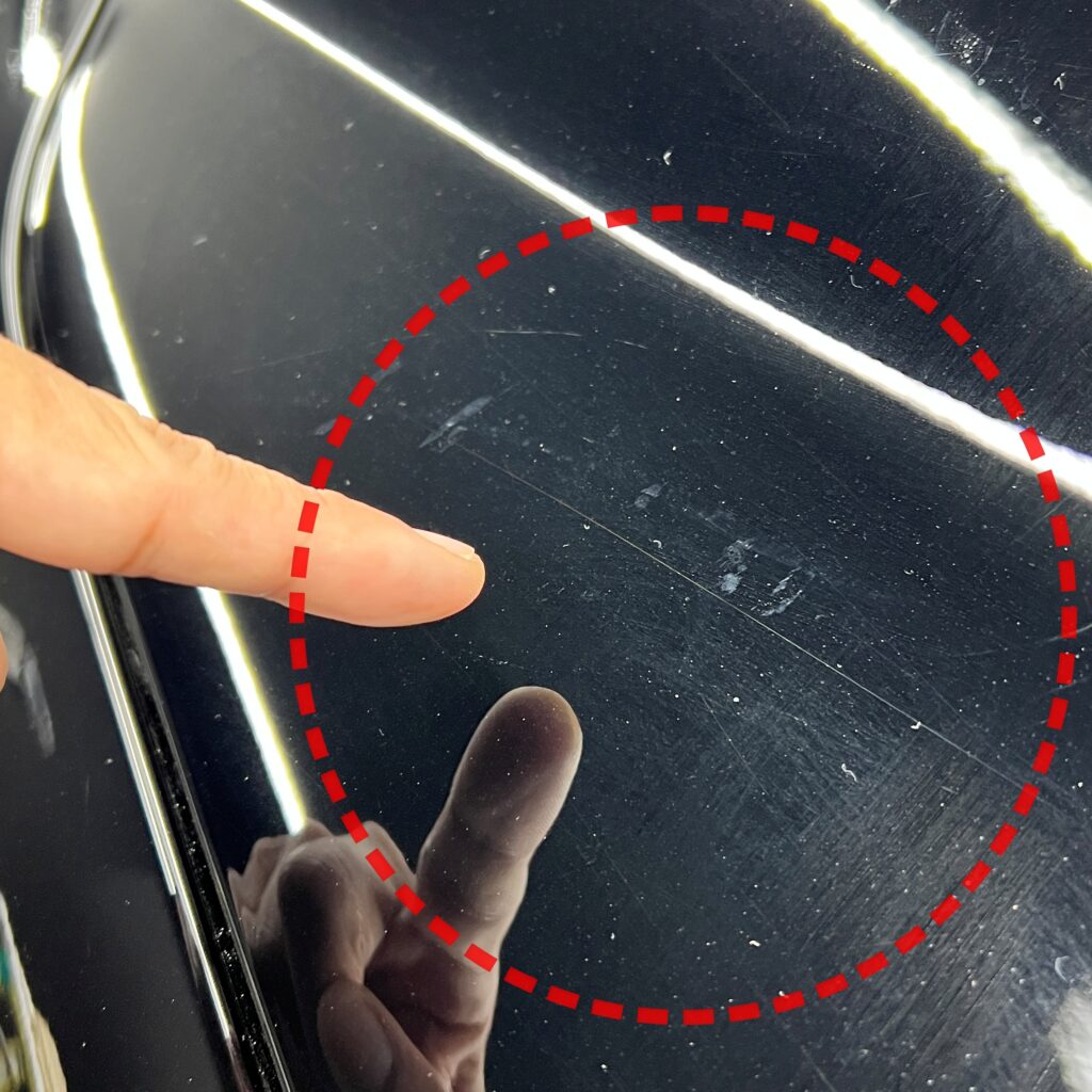 「新車=無傷」と思われがちですが、特にデリケートなブラックカラーの300系は、製造工程や輸送中に発生する微細なスクラッチ傷(洗車傷のようなもの)がどうしても付着してしまいます。